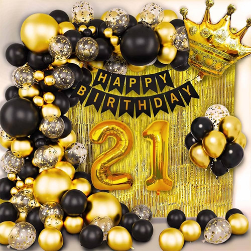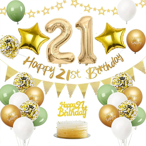 ست طاق بادکنکی بیست و یکم: این ست طاق بادکنکی بیست و یکم رنگ های اصلی مشکی، طلایی، نقره ای و ... می باشد که برای تزیین خانم ها و آقایان در جشن تولد ۲۱ سالگی بسیار مناسب است. آنها را می توان بر روی در یا دیوار آویزان کرد و همچنین برای استفاده در فضای داخلی و خارجی بسیار مناسب است تا جشن تولد 21 سالگی را برای مردان یا زنان ایجاد کند.