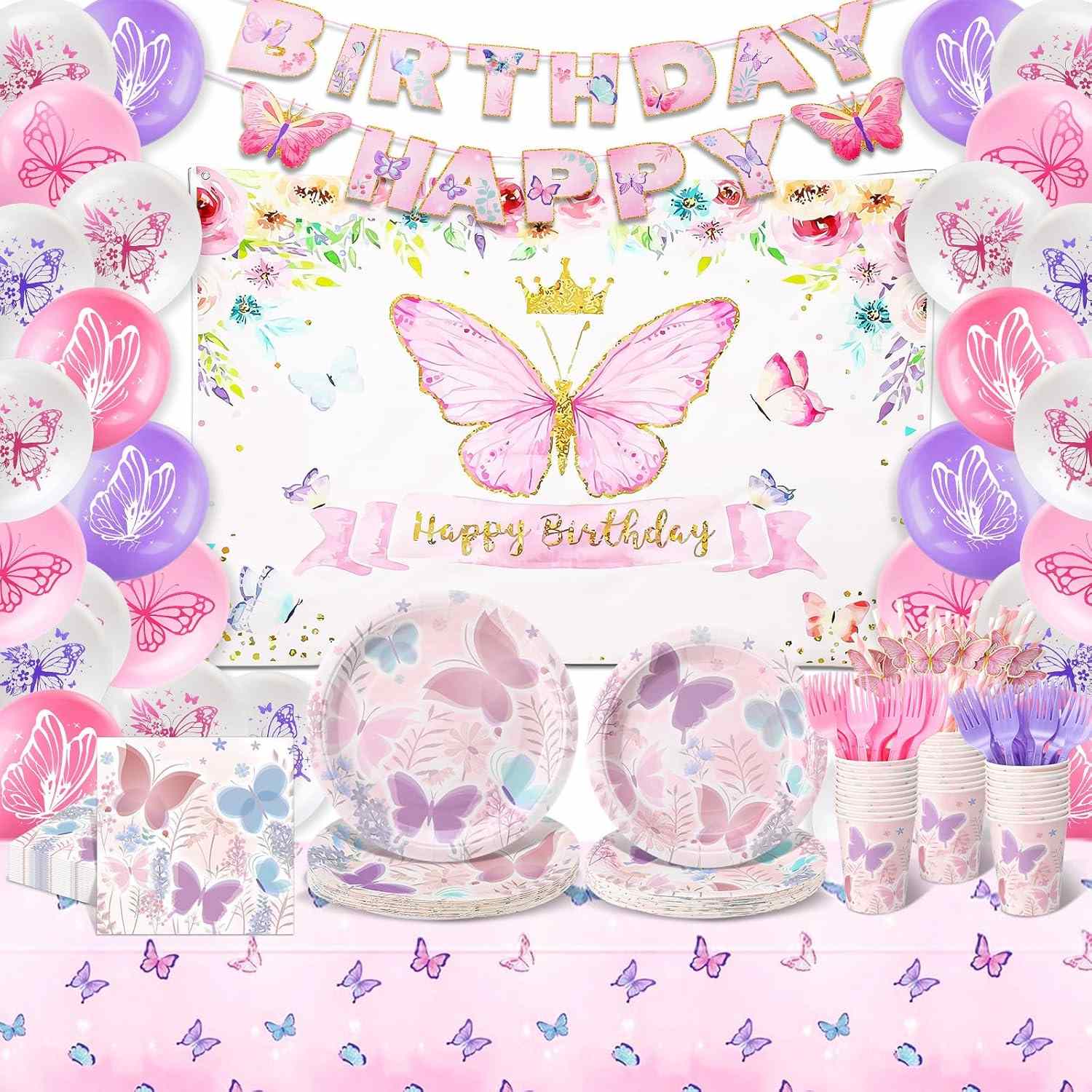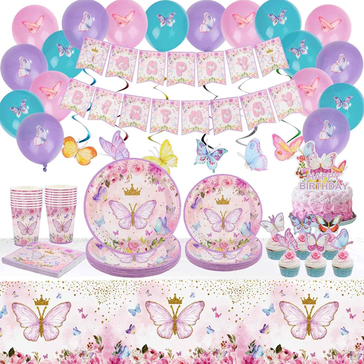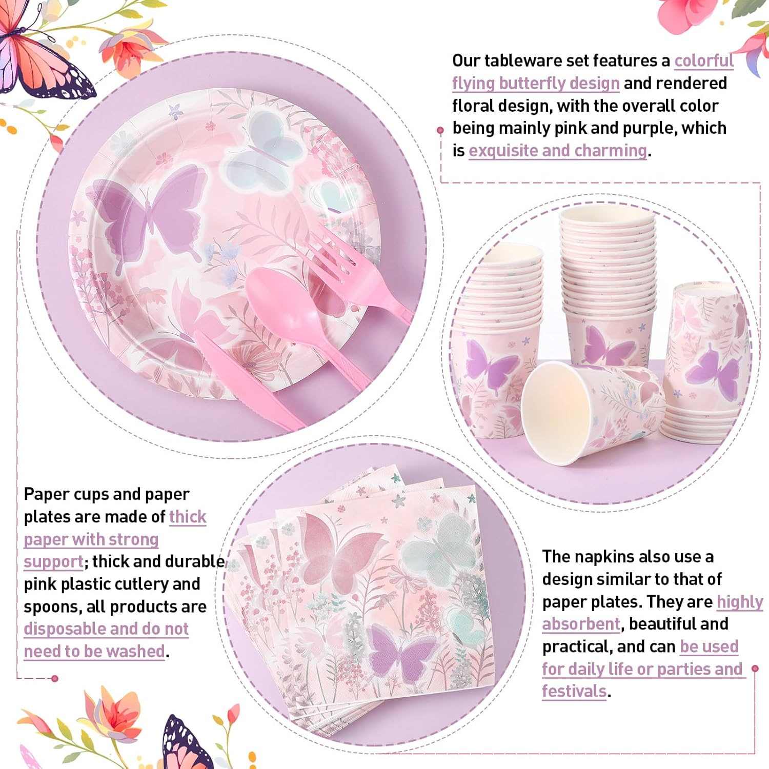 یک گزینه عالی برای دکور مهمانی ست ظروف مهمانی پروانه است. شامل دستمال، بشقاب کاغذی، لیوان کاغذی، چنگال و چاقو است. هر قطعه قطعات پروانه ها را نشان می دهد.
