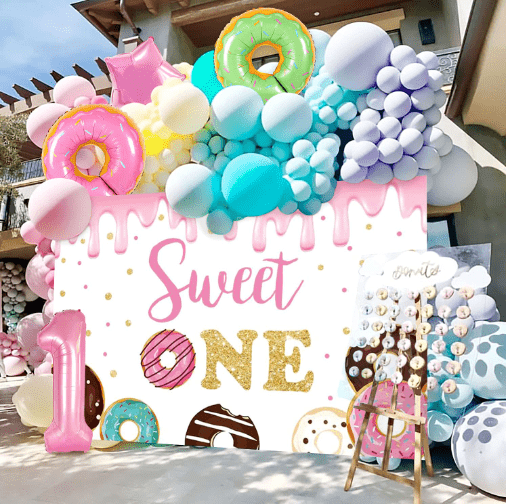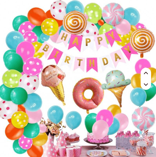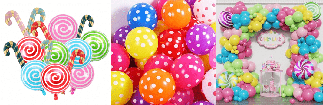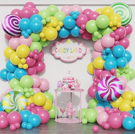 کیت حلقه گل بادکنکی تم آب نبات با رنگ آب نبات رویایی شیرین و شکل آبنبات چوبی زیبا به عنوان عناصر اصلی طراحی، سبک کلی سرزنده و شیرین است.