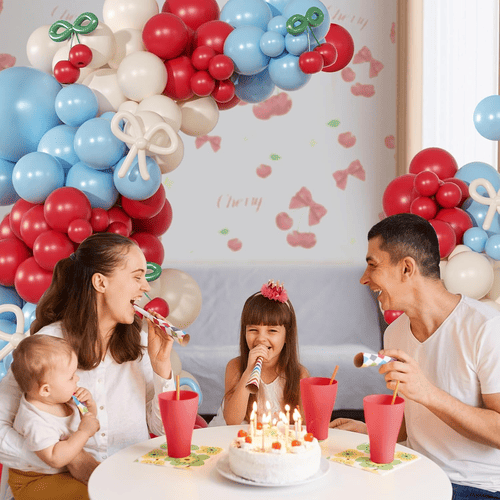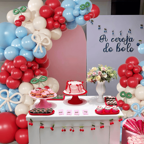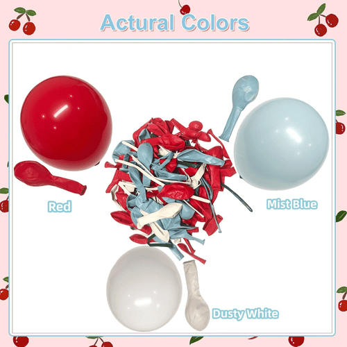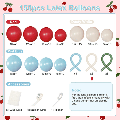 طاق بادکنک شکوفه گیلاس با بادکنک های لاتکس مختلف از جمله بادکنک لاتکس گرد و بادکنک لاتکس بلند ارائه می شود. سبک کلی کیت مثبت و بامزه است، مورد علاقه مشتریان در سراسر جهان قرار گرفت. رنگ بادکنک لاتکس گرد قرمز، سفید گرد و غبار و آبی مه آلود است. و برای بادکنک بلند لاتکس آبی مه آلود، سفید گرد و خاکی و سبز است، از بادکنک های بلند لاتکس برای ساخت پاپیون و استایل گیلاسی استفاده می شود.