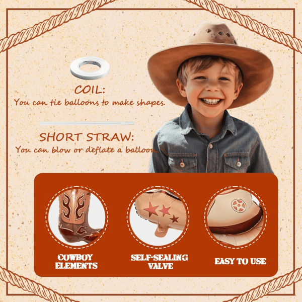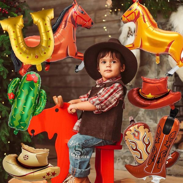 بادکنک های فویلی کابوی با هلیوم:بادکنک های فویلی گاوچران و بادکنک های لاتکس مربوطه را با هلیوم پر کنید، آنها جلوه شناور را حفظ می کنند. چه در فروشگاه قرار گیرد و چه در خیابان نمایش داده شود، می تواند توجه همه را به خود جلب کند. بادکنک های فویلی اسب خوشتیپ، بادکنک های فویل دار کلاه گاوچران با لبه های پهن و بادکنک های فویلی چکمه های کابوی که با شعله های آتش می سوزند - همه آنها به سادگی غیرقابل مقاومت هستند.