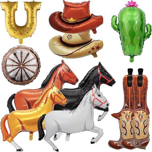 ست حلقه گل بادکنک فویلی کابوی:ویژگی اصلی این ست گلدسته بادکنکی، بادکنک های فویلی اسبی است که در هوا اوج می گیرند. برای ایجاد این جلوه می توانید آنها را با چسب نقطه و روبان ثابت کنید. علاوه بر این، بادکنک فویلی کلاه گاوچرانی را اضافه کنید و بادکنک فویلی چکمه های کابویی ترکیب خوبی خواهد بود. بدنه اصلی ست از بادکنک های لاتکس با طرح های غربی تشکیل شده است. تقریباً 60 تا 80 عدد بادکنک با اندازه های مختلف از جمله قهوه ای، سیاه و سفید و سیاه و سفید و غیره وجود دارد.