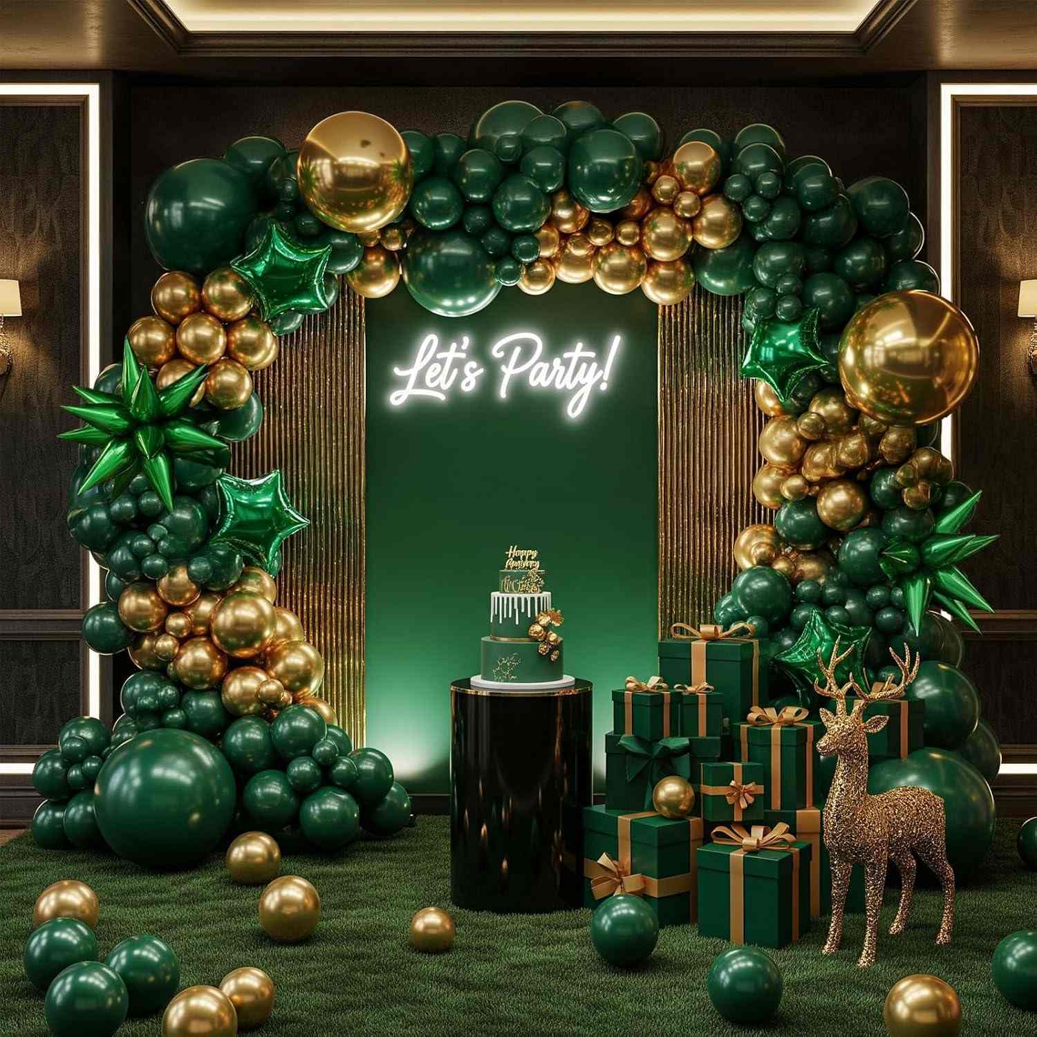 می توانید بادکنک فویلی ستاره طلایی، بادکنک فویلی ستاره سبز یا سایر اشکال فویل هم رنگ را به طاق بادکنک سبز و طلایی اضافه کنید. این تم سبز و طلایی را حفظ می کند. فویل براق آن را سه بعدی تر جلوه می دهد و بخش های کوچک روشنی را اضافه می کند. ستاره های طلایی مانند نور ستاره های پراکنده به نظر می رسند و ستاره های سبز مانند برگ پخش می شوند. قوس از رنگ های مسطح به یک اثر هنری با بافت و شکل تغییر می کند. به راحتی به کانون چشم نواز محل برگزاری تبدیل می شود.