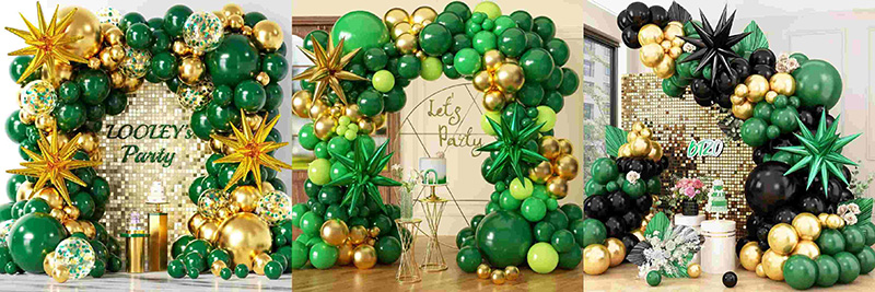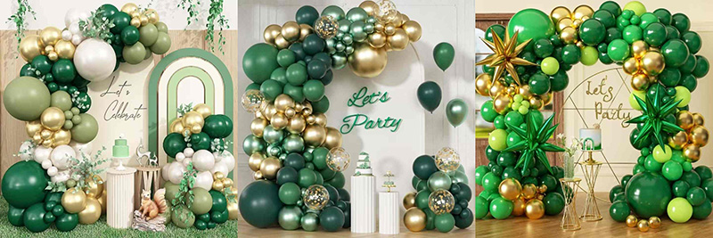 هنگامی که بالن های سبز مات، سبز تیره و سایر بادکنک های سبز با طلا مخلوط می شوند، سایه های مختلف سبز مانند زندگی یک جنگل و ظرافت قدیمی که در طاق ثبت شده است احساس می شود. طلا مانند نور خورشید می درخشد و کل رنگ را روشن تر می کند. رنگ سبز در حال تغییر قوس را زنده نگه می دارد و طلای فلزی سنگینی سبز را نرم می کند. نتیجه طبیعی، غنی و فانتزی به نظر میرسد که با بسیاری از صحنههای مهمانی یکپارچهسازی با سیستمعامل مطابقت دارد.