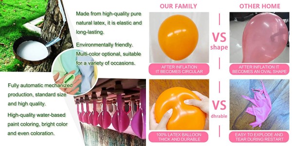 مواد اولیه بادکنک: ساخته شده از لاتکس طبیعی خالص وارداتی از آسیای جنوب شرقی. بادکنکها انعطافپذیرتر هستند، میتوان آنها را به اندازههای بزرگتر منفجر کرد، احتمال ترکیدن آنها کمتر است، و میتوانند به طور کاملا طبیعی بدون ایجاد آلودگی برای محیط زیست تخریب شوند.