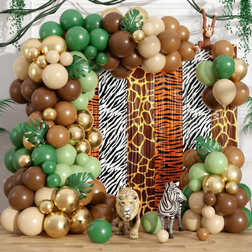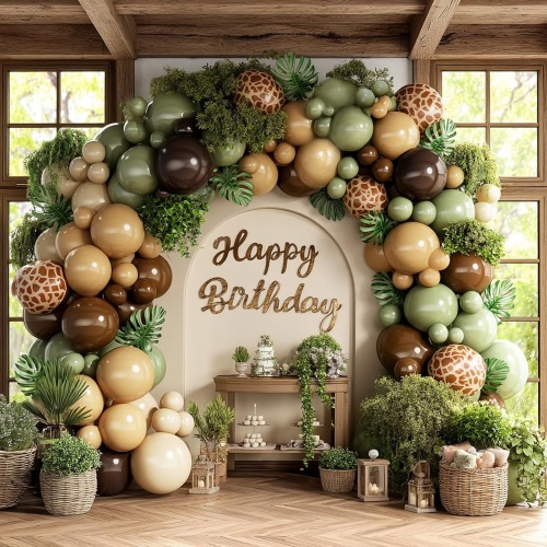 طاق بالون سافاری دارای عناصر اصلی تم جنگل است. بادکنک های قهوه ای نشان دهنده تنه درختان، بادکنک های سبز نماد برگ ها و بادکنک های مختلف چاپ شده حیوانات مختلف را به تصویر می کشند و احساس میزبانی یک مهمانی را درست در جنگل ایجاد می کنند. بدون زحمت یک صحنه مهمانی شیک و جوی ایجاد می کند.