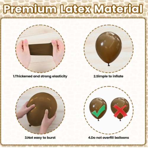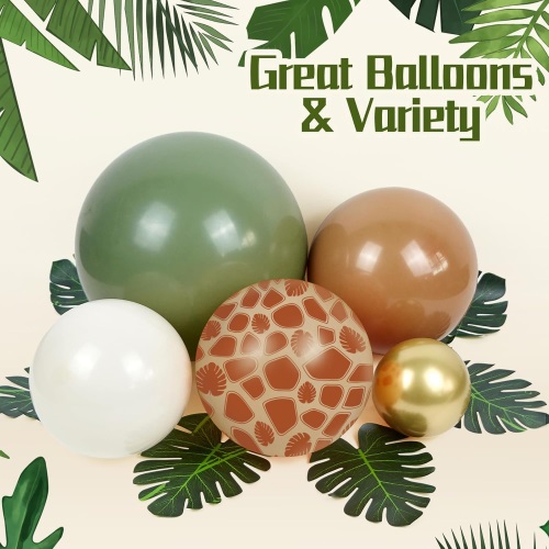 در هر قوس بالون سافاری بیش از 100 عدد بادکنک لاتکس وجود دارد. این شامل بادکنک های لاتکس سبز تیره 5 اینچی، 10 اینچی و 18 اینچی، بادکنک های لاتکس سبز آووکادویی 5 اینچی، 10 اینچی و 18 اینچی، بادکنک های لاتکس قهوه ای 5 اینچی، 10 اینچی و 18 اینچی، بادکنک های لاتکس سفید شنی 10 اینچی، بادکنک های لاتکس سفید شنی 10 اینچی، بالون های لاتکس سبز 10 اینچی است. بادکنک لاتکس طلای کروم 10 اینچی، بادکنک لاتکس 12 اینچی کانفتی، بادکنک چاپ زرافه 12 اینچی، بادکنک چاپ ببر 12 اینچی و لوازم جانبی بادکنک.