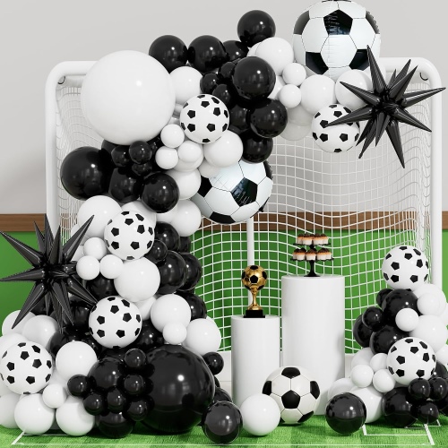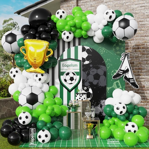 کیت ها شامل 12 اینچ سبز تیره استبادکنک های لاتکسبادکنک لاتکس مشکی 12 اینچی، بادکنک لاتکس کانفتی سبز 12 اینچی، بادکنک لاتکس نقره ای فلزی 12 اینچی، بادکنک لاتکس چاپ فوتبال 12 اینچی، بادکنک فویل فوتبال، بادکنک فویلی ستاره، بنر کاغذی مبارک تولد، گل های کاغذی نواری و لوازم جانبی مانند توپ، گل های کاغذی.