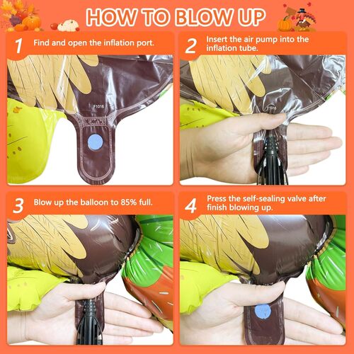 بادکنک های فویل شکرگزاری به راحتی باد می شوند و مهر و موم می شوند. می توانید از پمپ دستی یا پمپ برقی برای باد کردن استفاده کنید و سپس آن را با چسب خود چسبی که در نازل هر بادکنک قرار دارد ببندید. پس از مهر و موم شدن، بالون قوی خواهد شد.